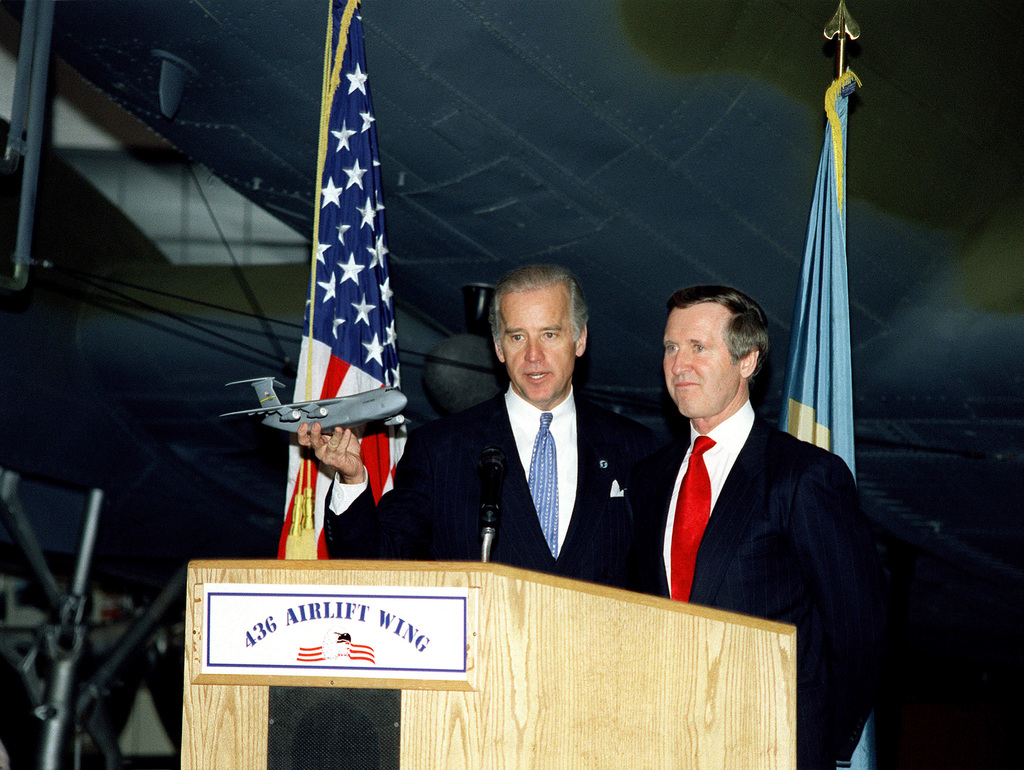 Delaware Senator Joesph Biden presents Secretary of “Defense” William Cohen with a model C5 aircraft at a luncheon in Sec. Cohen’s honor during his visit to Dover Air Force Base on Wednesday, December 15, 1999.